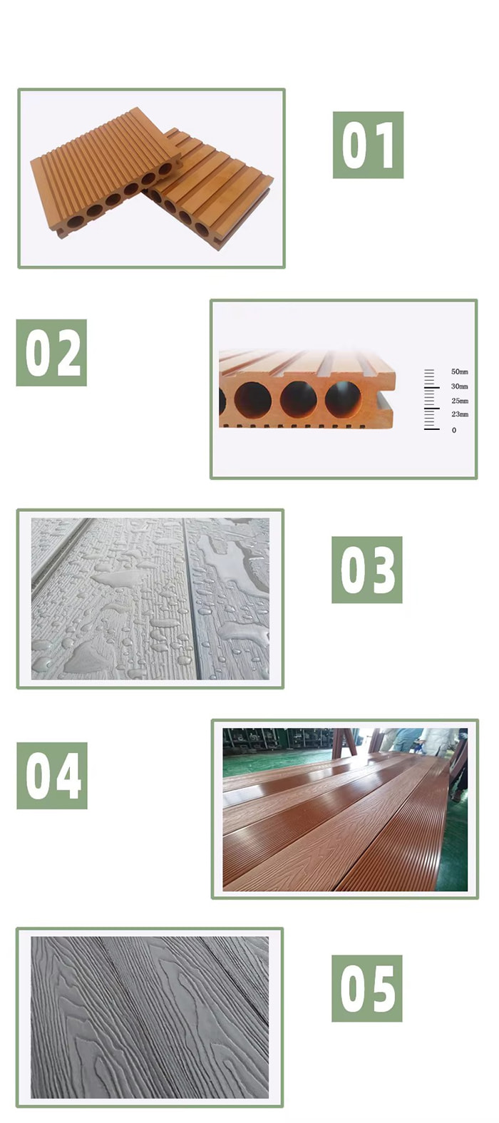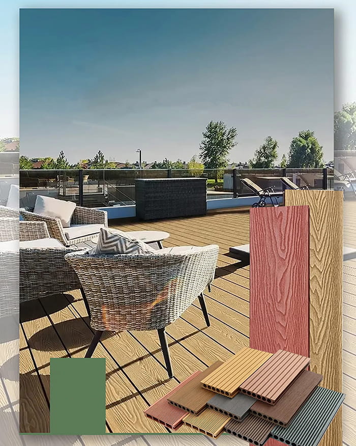 Materiaal: Composiet van houtvezels en thermoplastische materialen (zoals polyethyleen of polyvinylchloride)