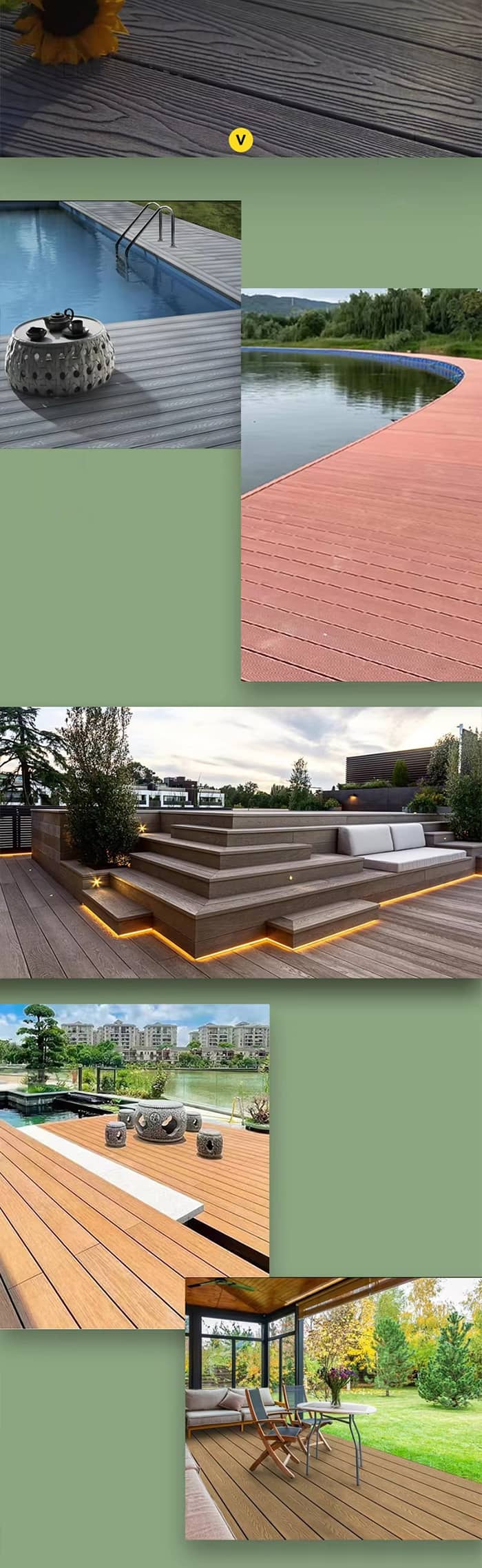 Buitenomgeving: Zoals terrassen, terrassen, tuinpaden, commerciële voetgangersstraten enz., met sterke weersbestendigheid, anti-insecten, geschikt voor gebruik buitenshuis