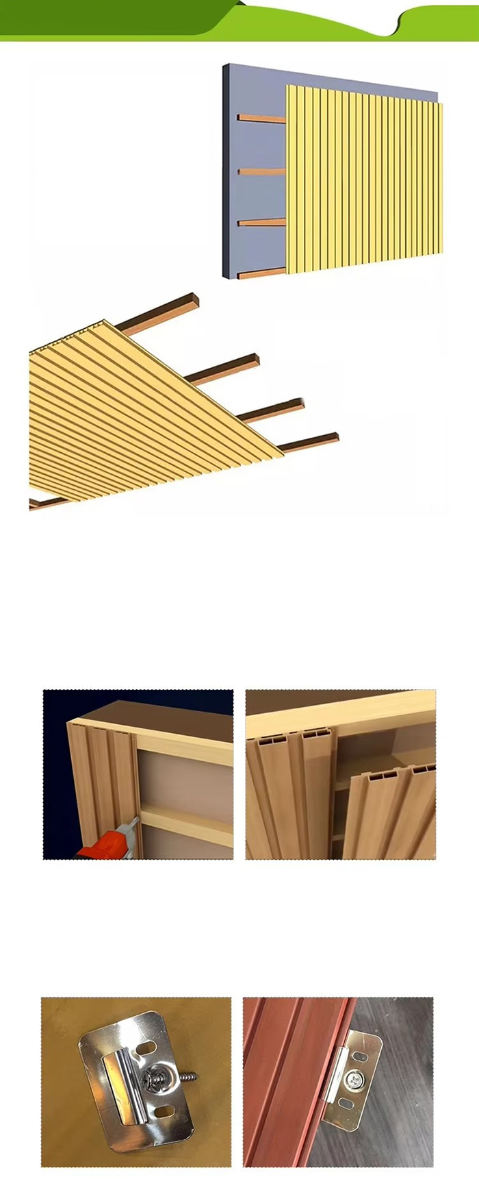 Milieubescherming: WPC-binnenbord is een recyclebaar materiaal. Bij het productieproces worden afvalhout en plastic gebruikt, waardoor het verbruik van natuurlijke hulpbronnen wordt verminderd en wordt voldaan aan de eisen op het gebied van milieubescherming.