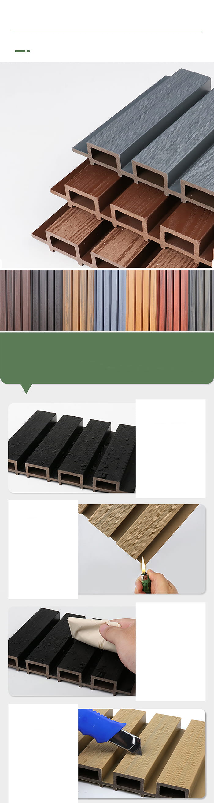 Kwaliteitscontrole: Tijdens het productieproces worden WPC-buitenpanelen strikt geïnspecteerd op kwaliteit, inclusief maatnauwkeurigheid, vlakheid, dichtheid, brandwerendheid, milieubeschermingsprestaties, enz.