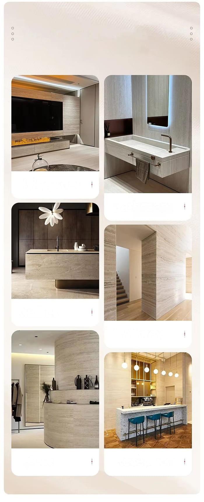 Binnenmuren bouwen: Kan worden gebruikt voor binnenmuurdecoratie van woningen, kantoren, hotels, winkelcentra, scholen, ziekenhuizen, kantoorgebouwen, villa's, luxe gemeenschappen, enz., zoals achtergrondmuren, keukens, badkamers en andere ruimtes.